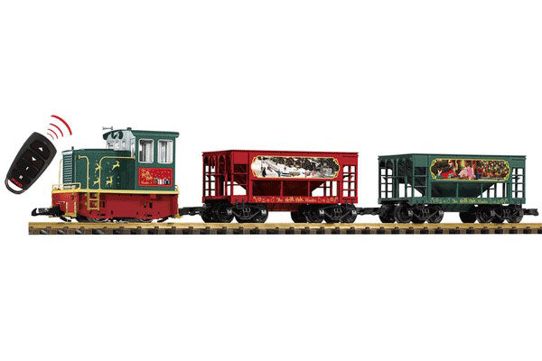This starter set comes with a loco and two cars, R/C Controller (22V / 1.6A + 16V DC) with forward/reverse and speed and stop controls, pocket remote, power clamps, a full circle of outdoor/indoor track (R1 radius 600mm / 23.6"), track clips, and a safety-approved transformer (120v, 24V DC, 45 VA).