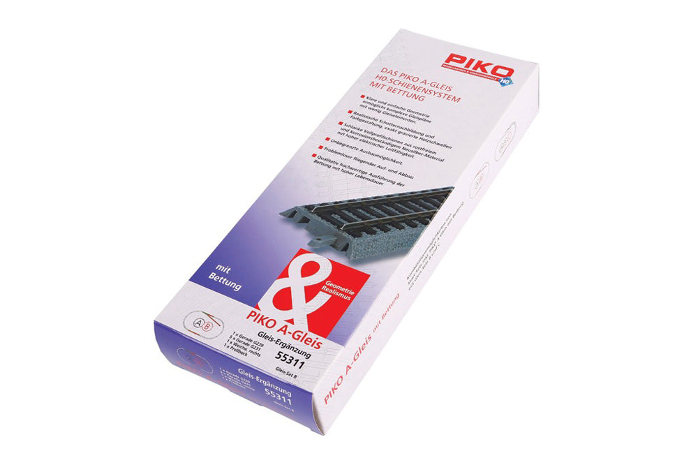This set contains only the track pieces listed above, or colored in the image. Starter sets with PIKO Roadbed A-Track come with Set A, or separate pieces can create your basic loop.
